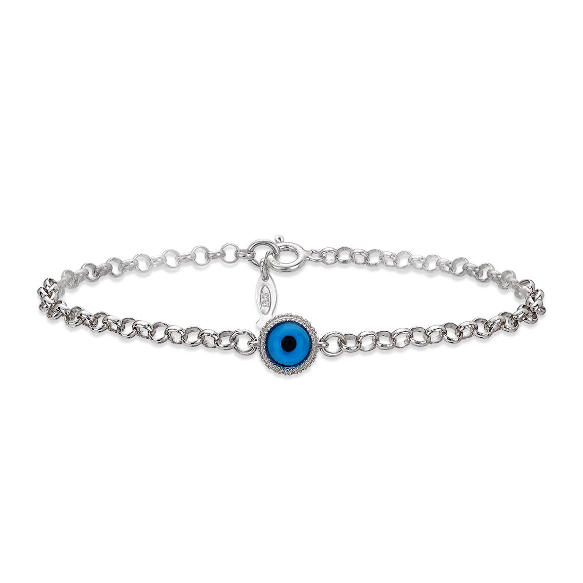 925 Sterling Silver. RH Rhodium plated White Gold or AU 24k plated Yellow Gold. Genuine Cubic Zirconia surround Cat Eye Charm. Item comes without Blue Bead. By Kurshuni